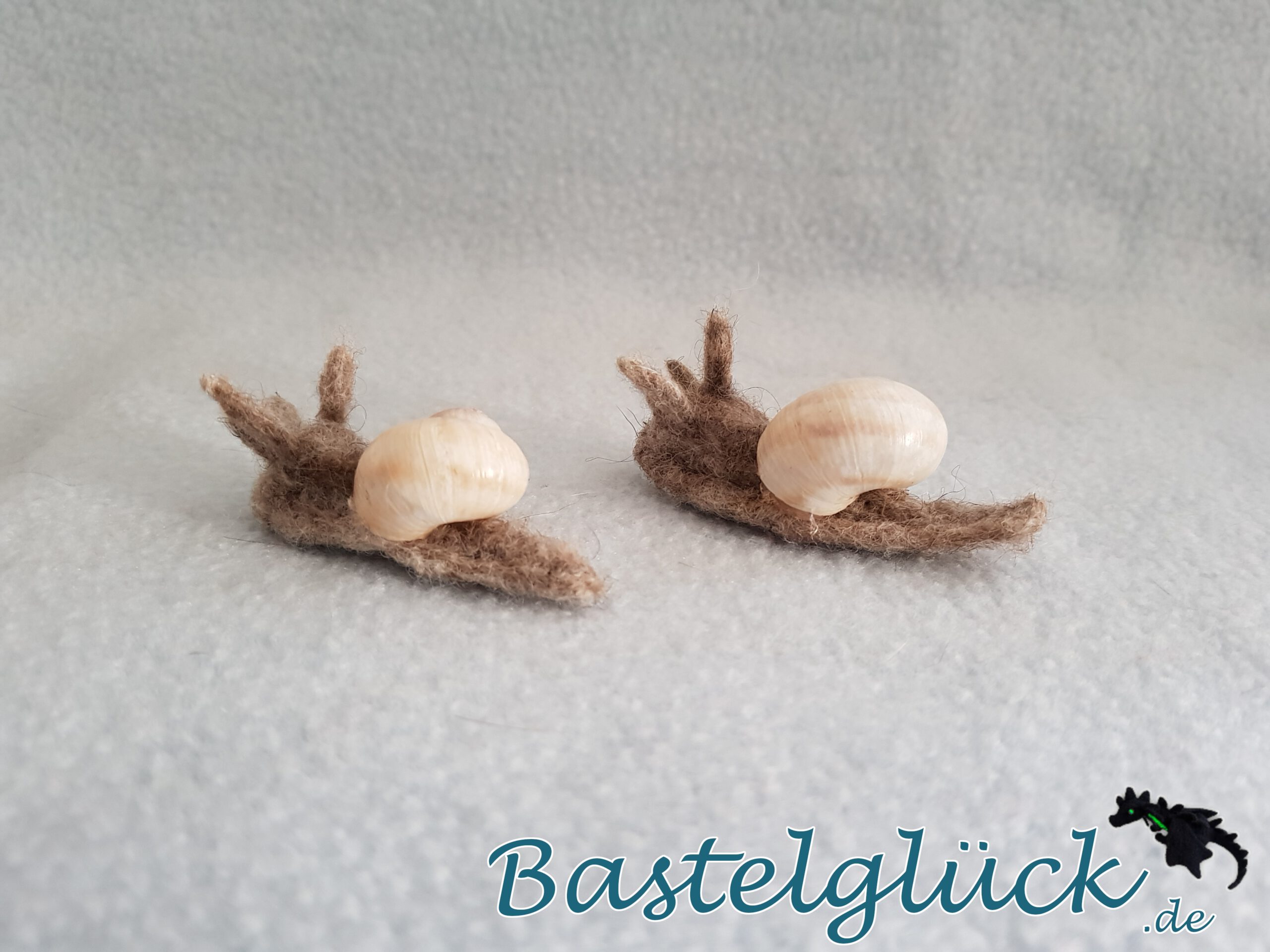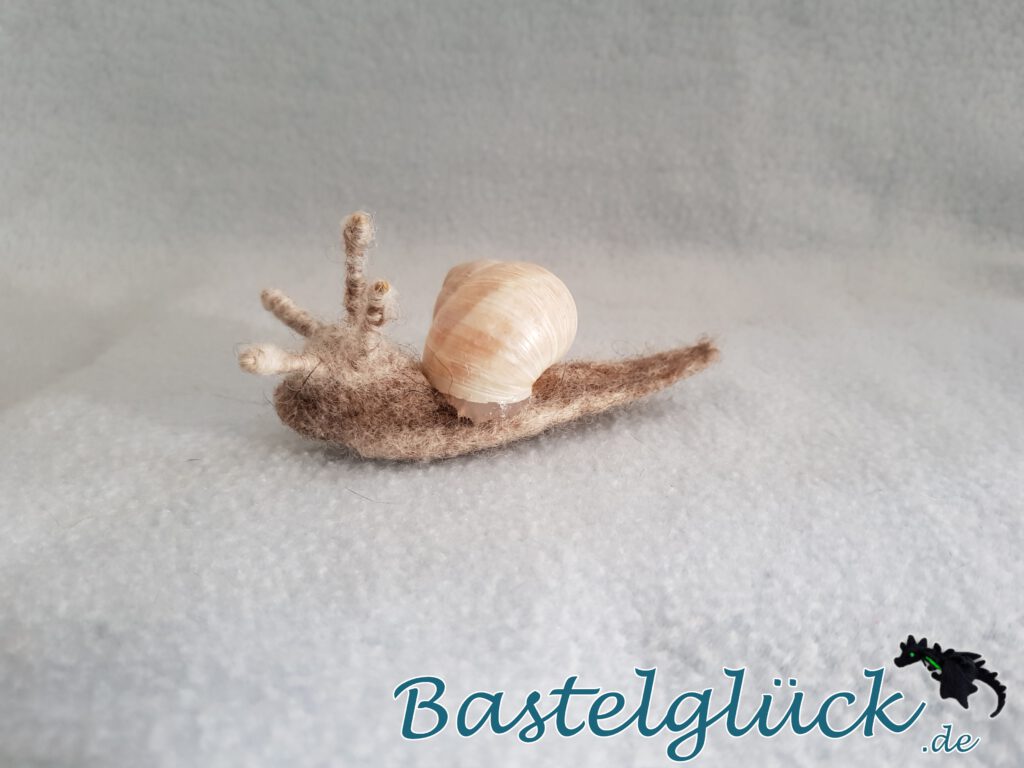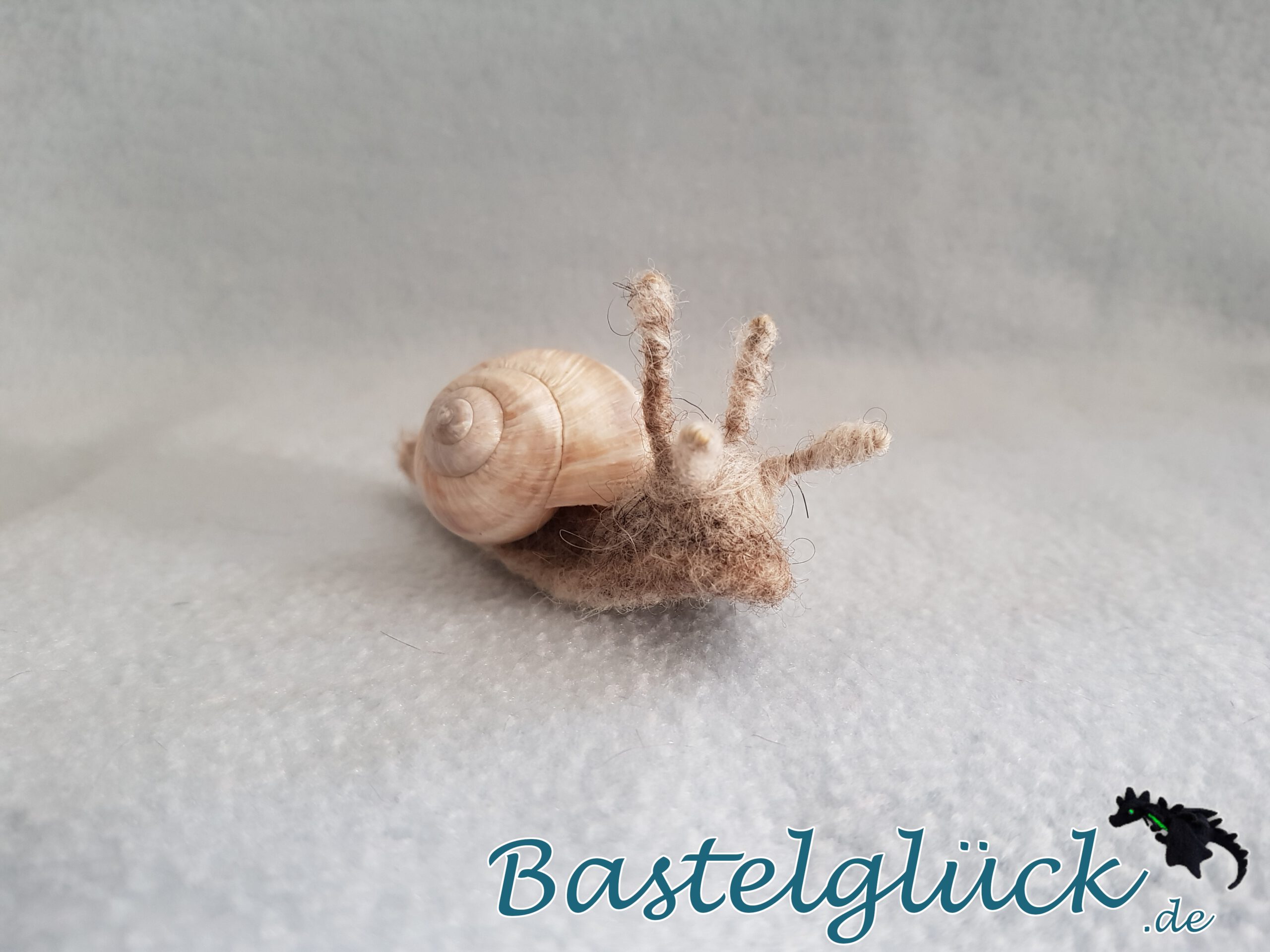 Eine mit der Nadel gefilzte Schnecke sucht sich ihren Weg. Das Schneckenhaus ist lackiert und mittels Heißkleber auf der Schnecke befestigt worden.